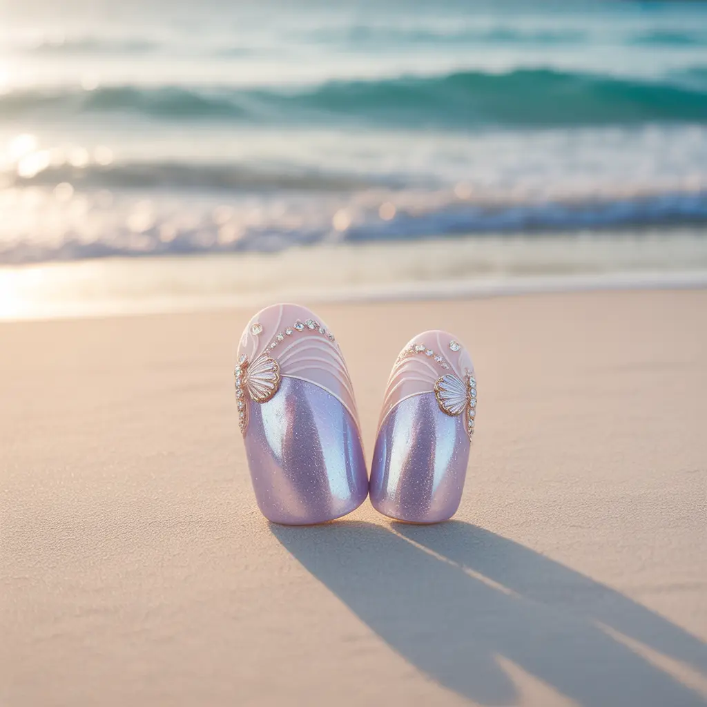 - Minimal Shell Accents: Nude or light blue nails with a single shell decal or gold flake on the ring finger.