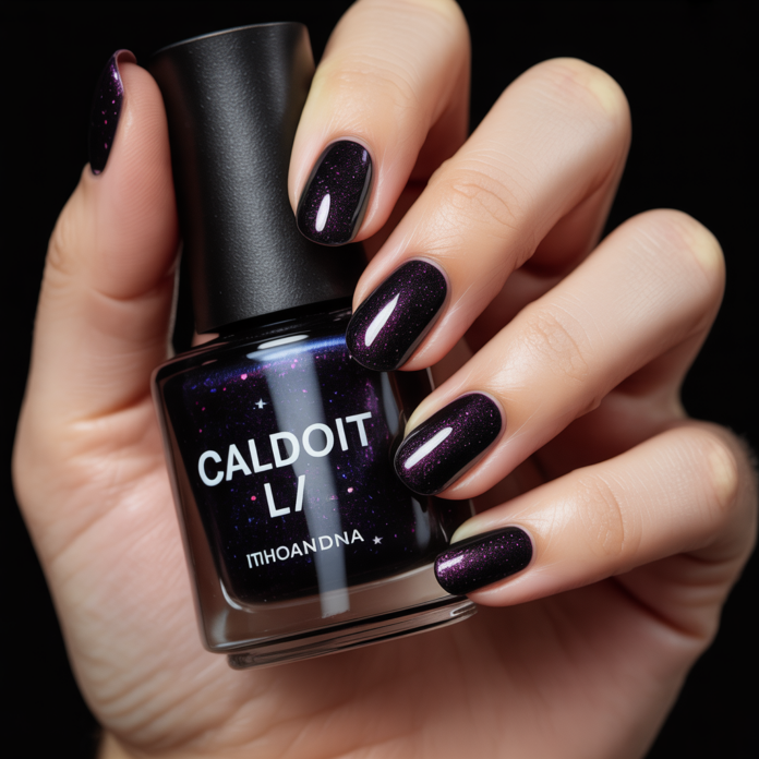 Start with a glossy jet-black polish and layer a fine black or charcoal glitter top coat. The result is a sophisticated, high-shine look that works for work and weekend.