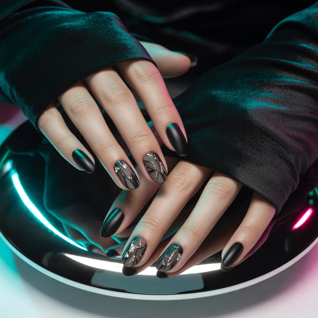 - Or choose matte black nails with velvet textures and layered necklaces for a moody, romantic look.