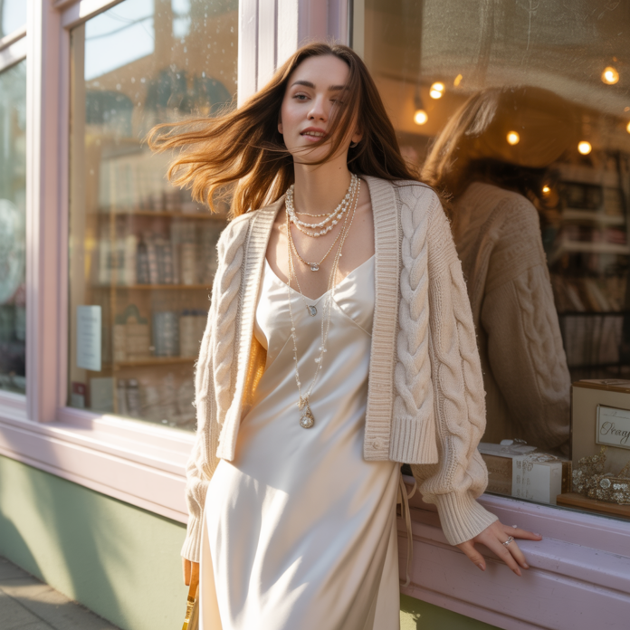 - Date night: satin slip dress + fitted cropped cardigan + strappy heels.