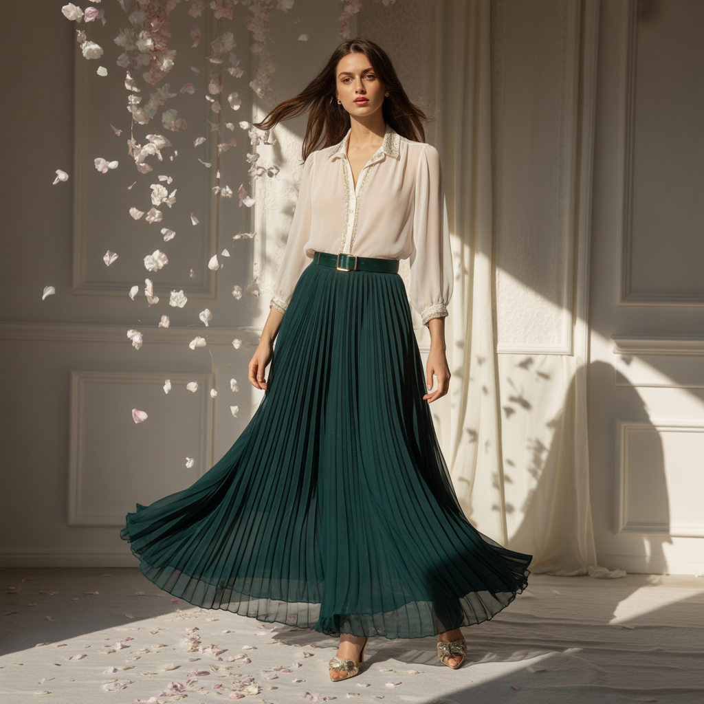 - Tailored blazer + pleated maxi + slim belt: Structure the top half to balance the skirt’s movement and maintain a professional vibe.