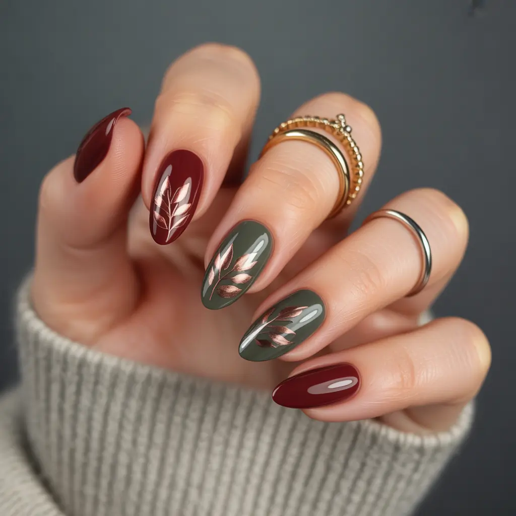 Delicate leaf designs in gold or metallic green add an elegant, seasonal touch. Use a thin nail art brush or stamping plate for crisp lines that complement floral scarves and earth-toned layers.