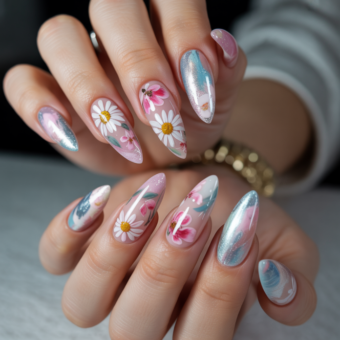 - Watercolor floral manicures — soft, blended petals for a romantic look.