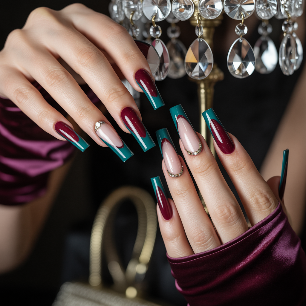 - Cocktail party: Jewel-tone dress with metallic accent nails (one or two nails). Makeup: luminous skin, dewy highlighter, and lacquered lips.