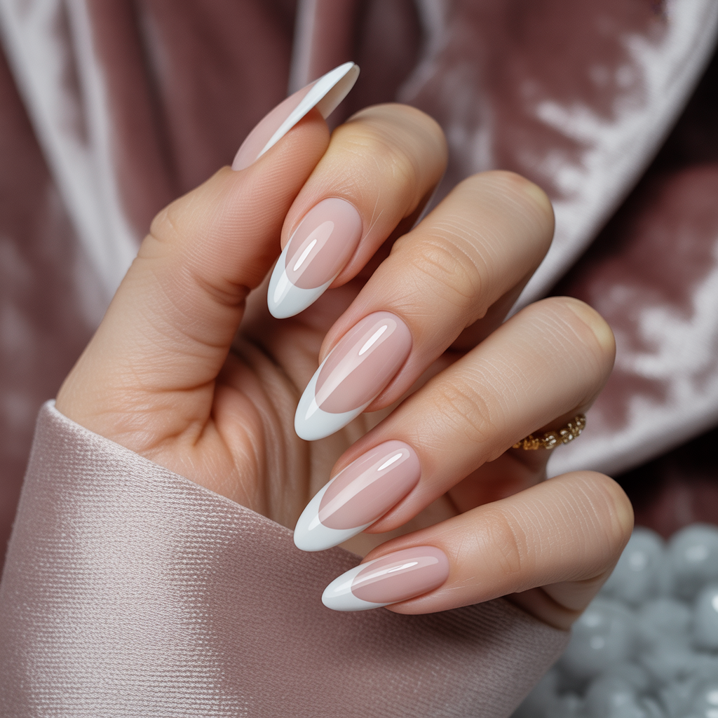 - Classic French: white crescent tips with a sheer pink or nude base.