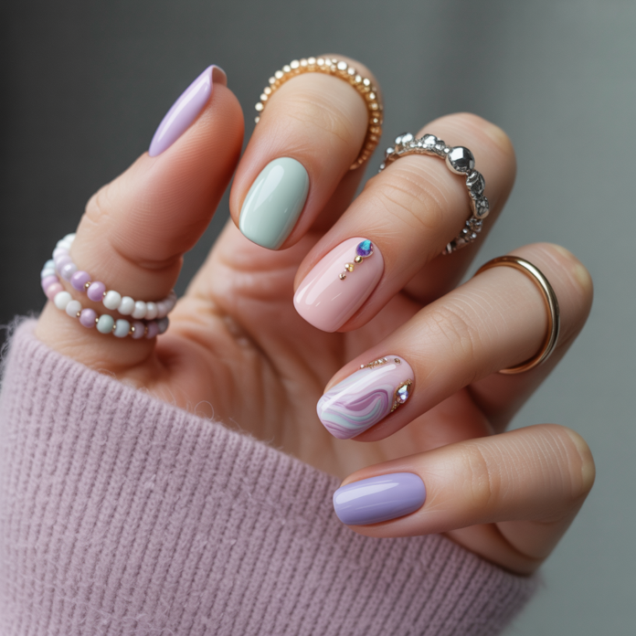 - Casual daytime: pastel nails with a white tee, denim jacket, and ballet flats — cute and effortless.