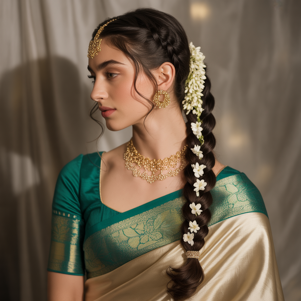 - Light georgette/chiffon: Loose waves or side braids work beautifully with minimalistic pieces.