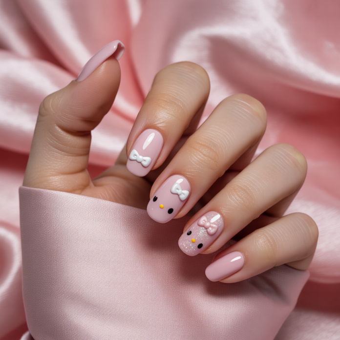 - One or two small Hello Kitty decals on a soft pink or nude base — great for work-friendly kawaii.