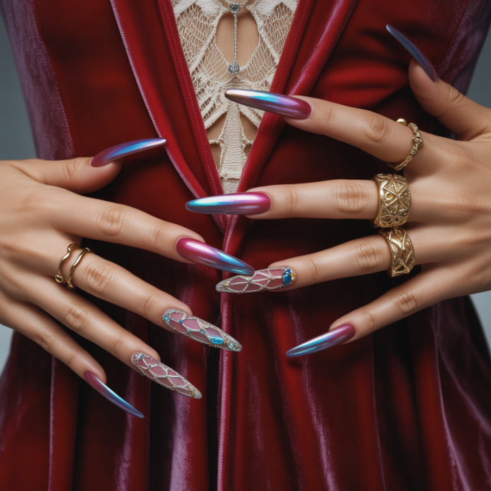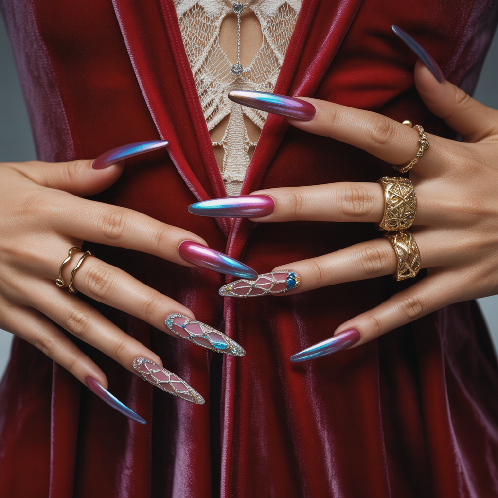 - Evening glamour: Stiletto or coffin-shaped long nails with deep reds, metallics, or bold nail art complement satin dresses and dramatic earrings.