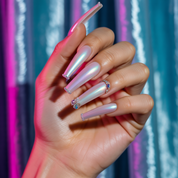 - Stiletto or coffin long nails with chrome or holographic finishes.