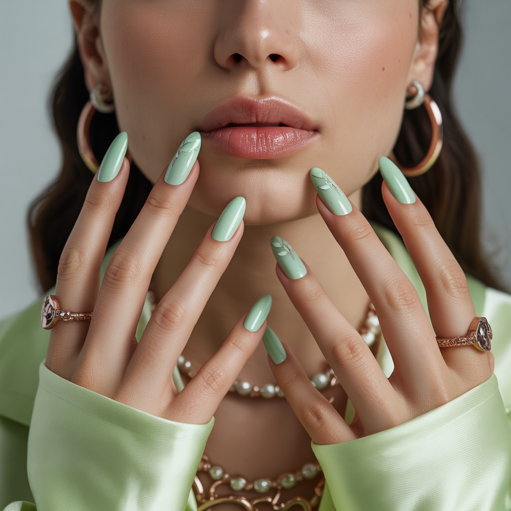 - Monochrome cool tones: Soft mint nails with cool-toned eye shadows (taupes, soft green, or champagne shimmer) for a cohesive aesthetic.