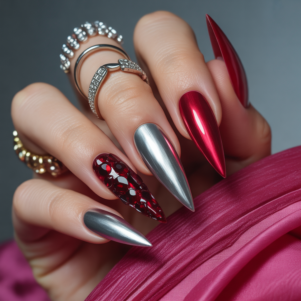 - Go full glam: long pointed nails with metallics, rhinestones, or negative-space art.