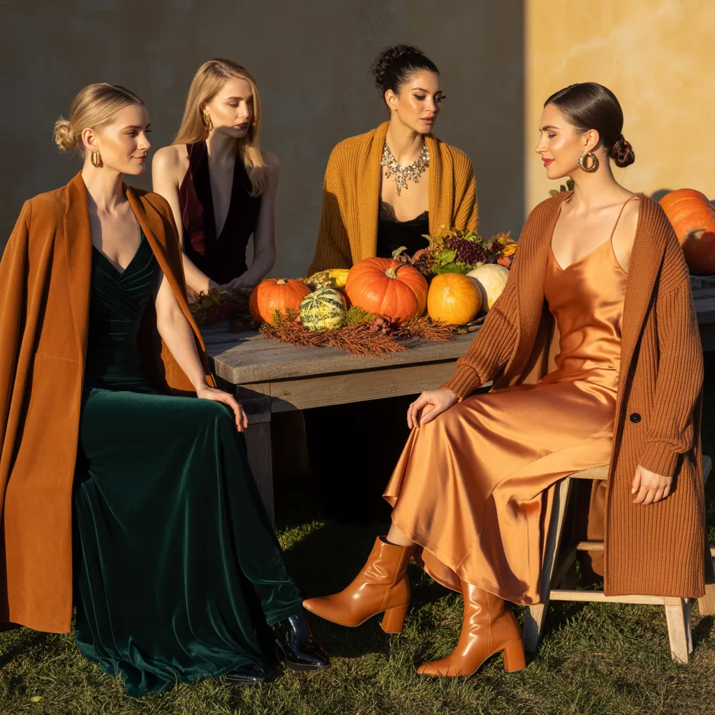 Autumn hues—rust, olive, mustard, camel, and deep burgundy—are classic for Thanksgiving and photograph beautifully. Lean into textures: knits, suede, wool blends, and satin create interest without needing patterns. Practical advice: