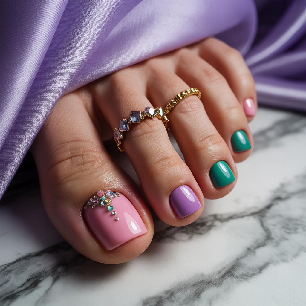 - Color-blocked toenails — mix two contrasting colors for a fun effect.