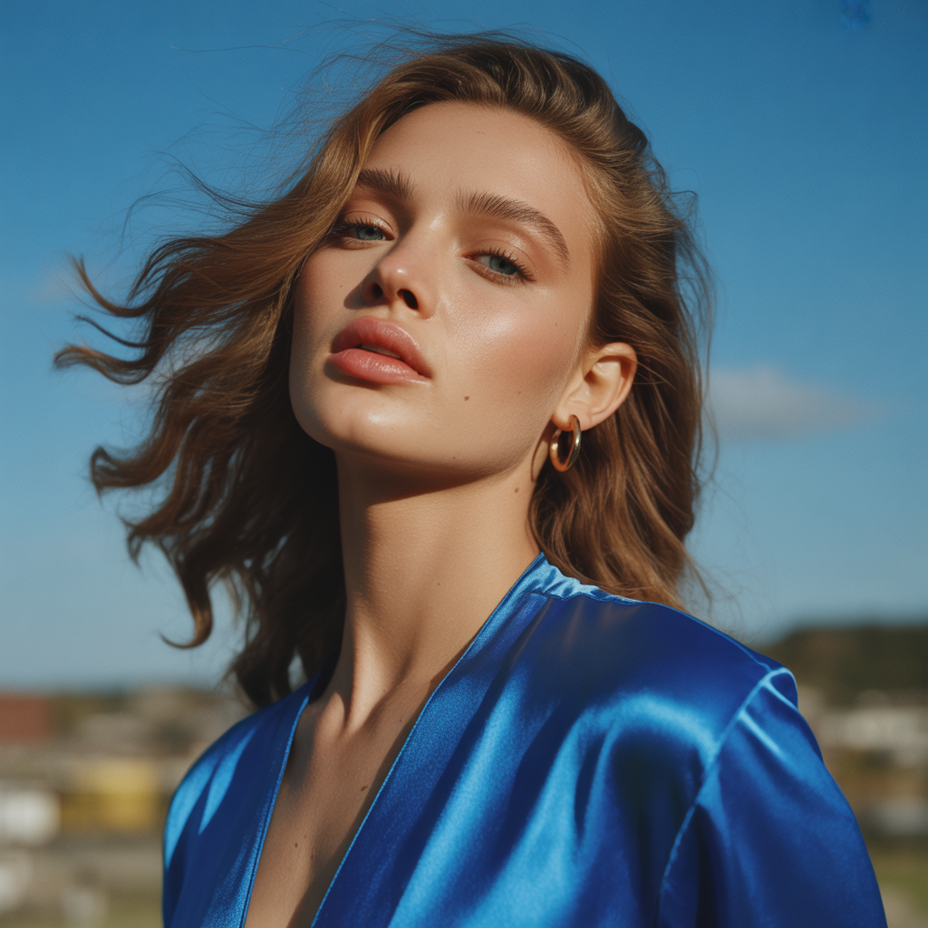 - Finishing: luminous highlighter on the cheekbones catches the light beautifully when wearing satin or silk blue tops.