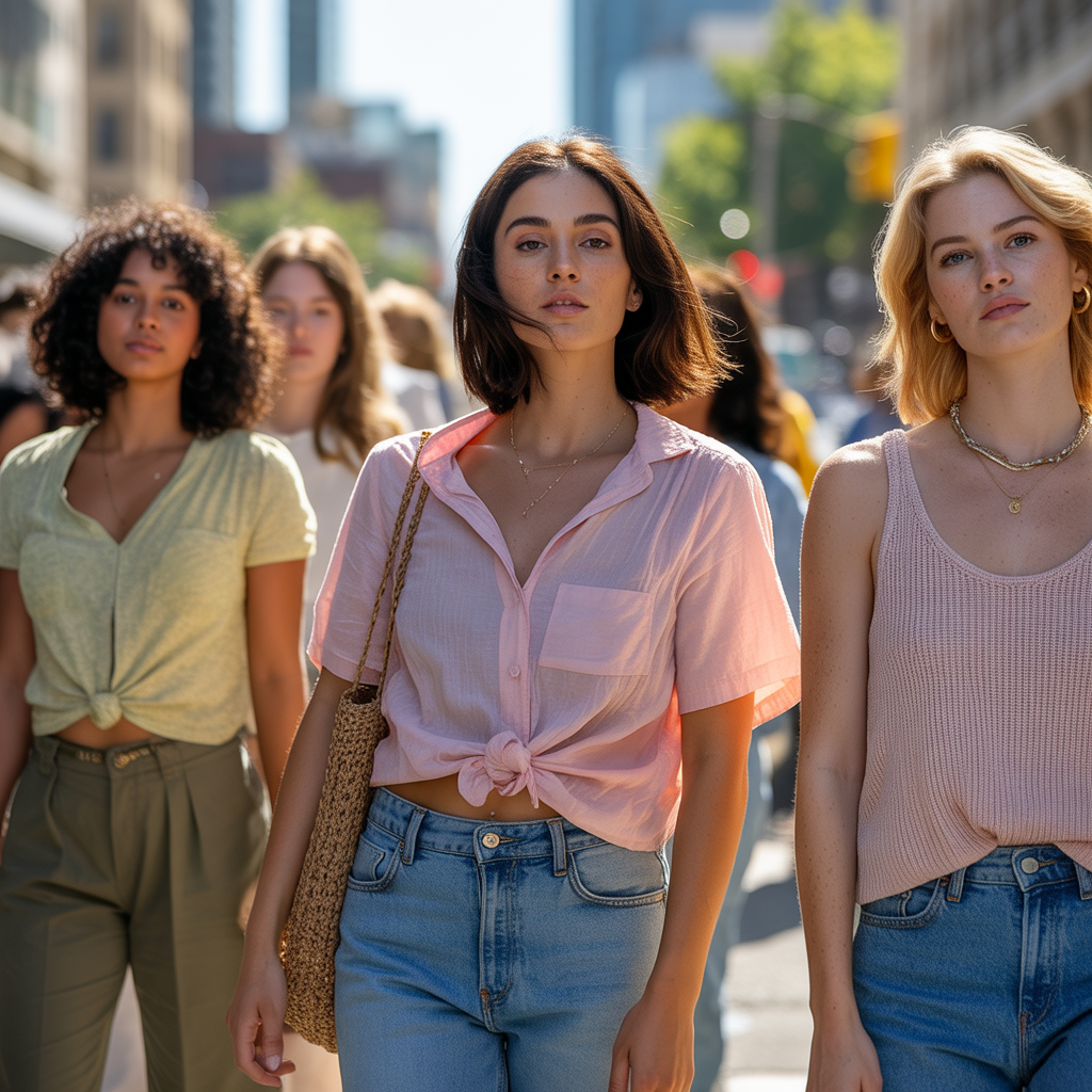 Neutrals (white, black, navy, camel) are wardrobe anchors. Add prints — stripes, small florals, or subtle checks — for variety. If you want a pop, choose one statement-colored top each season.