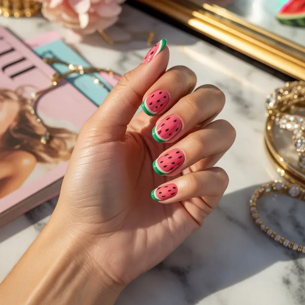 Absolutely. Watermelon nail designs translate beautifully to short nails—focus on small slice accents, seed-only patterns, or a simple gradient. Short nails keep the look chic and practical for everyday life.