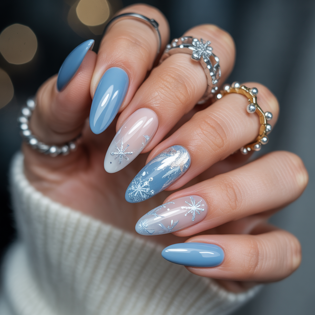 - Snowflake accents on a single nail — delicate and festive without being over the top.